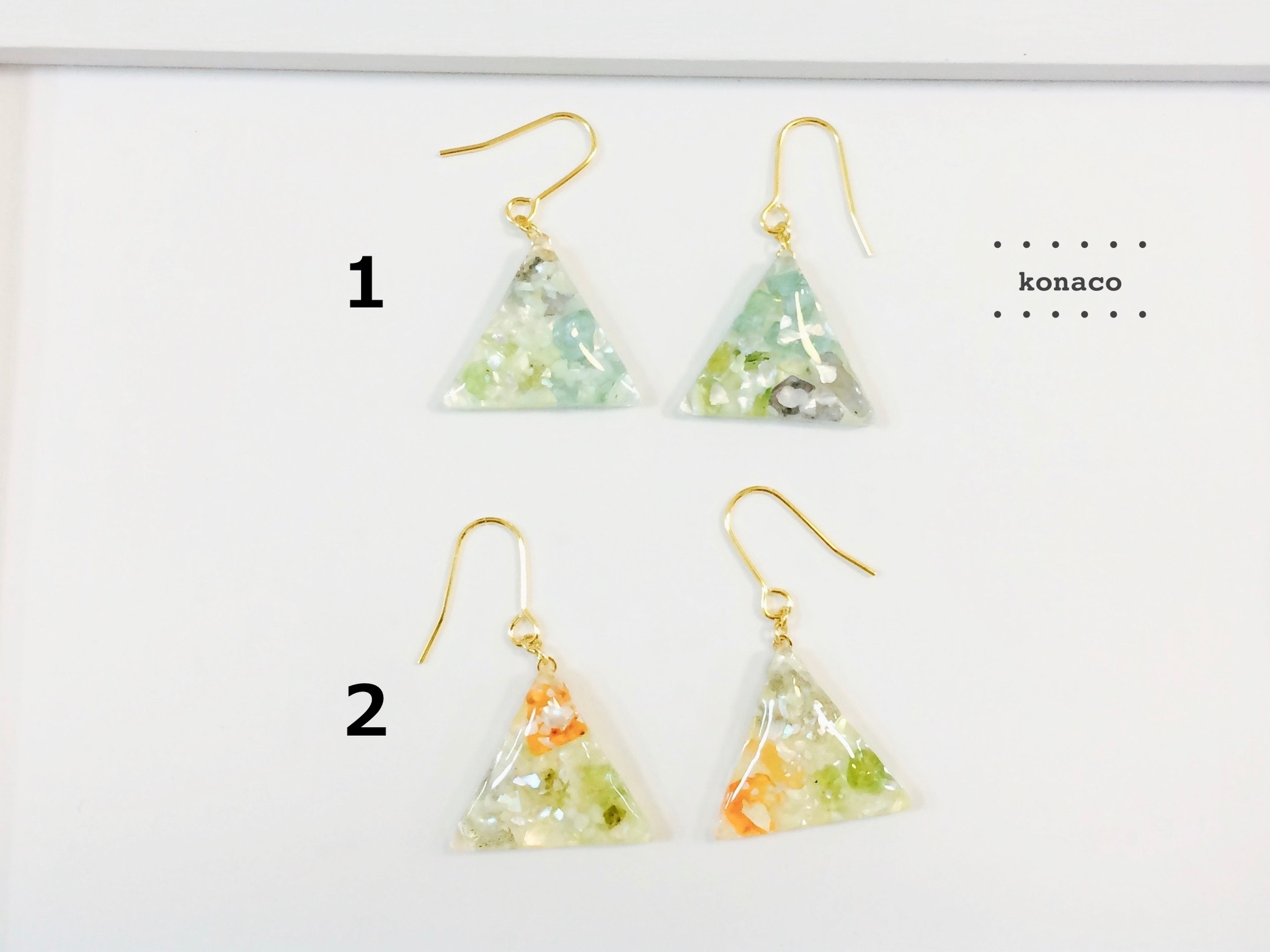 このピアスのポイントは、クリアレジンに天然石を埋め込んださんかくパーツです。